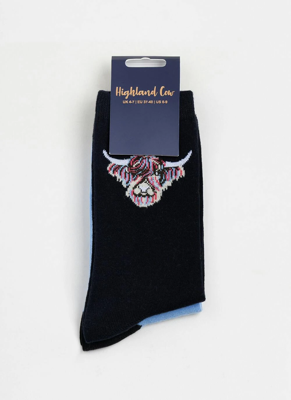 2 x socks with colourful highland cow design, crafted from a soft, cotton-rich blend that keeps your feet cozy. Featuring adorable highland cow designs, these socks bring a delightful quirky charm to your wardrobe. UK size 4-7.