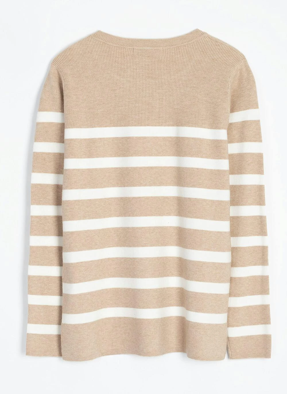 Designed in a soft touch yarn, this jumper by Isle is the perfect base for any outfit. Designed in a slim fit with a classic crew neck and long sleeves for added cosiness. Side splits allow for extra movement and comfort. Finished with a flattering stripe and button detailling on the shoulder.