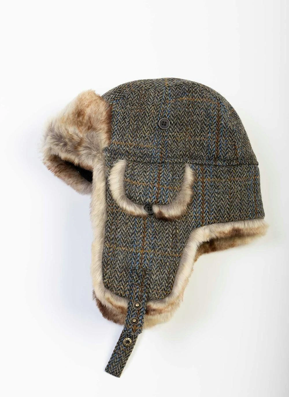 Our HARRIS TWEED ® Trapper Hat offers the perfect blend of practicality and countryside appeal. Crafted from 100% pure virgin wool, dyed and hand-woven in Scotland’s Western Isles, the earthy herringbone fabric is complemented with a snug faux-fur lining and trim. The ear flaps can be buttoned up, and the larger flaps held above the head with press-studs for when the weather turns.