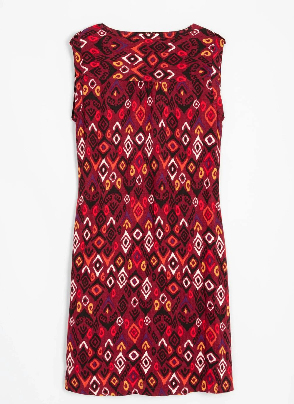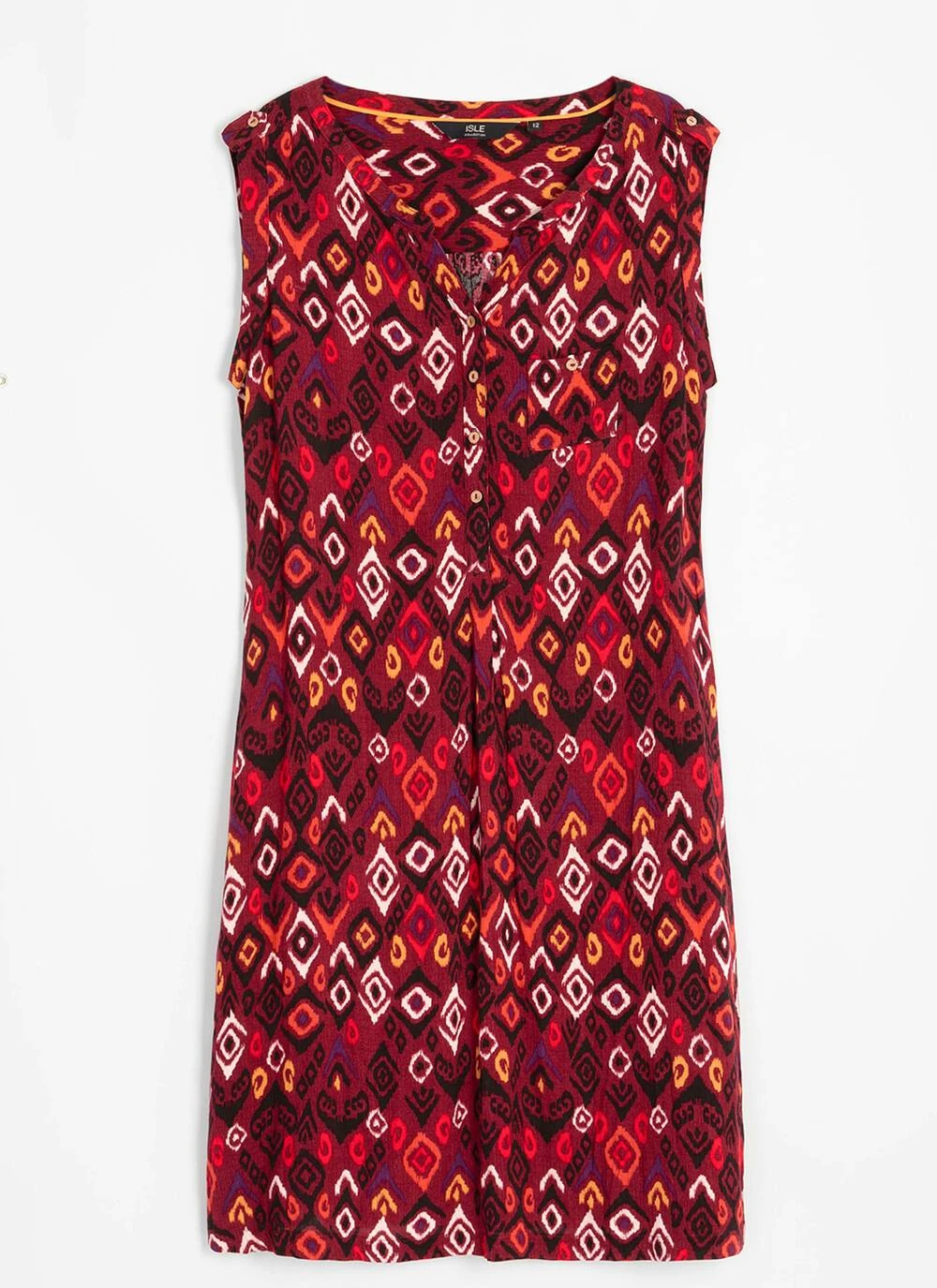 The ISLE Ikat Print Shift Dress is a bold and vibrant addition to your wardrobe, featuring rich hues of red, orange, and yellow in a stunning ikat pattern. This dress combines comfort with striking design, making it an eye-catching choice for any season. The shift style offers a relaxed, flattering fit, while the bright colours bring energy and warmth to your look.