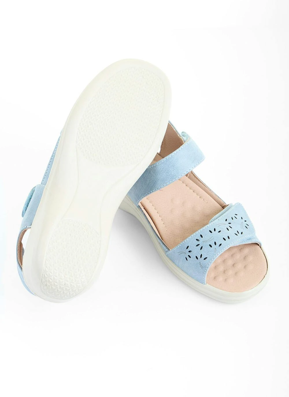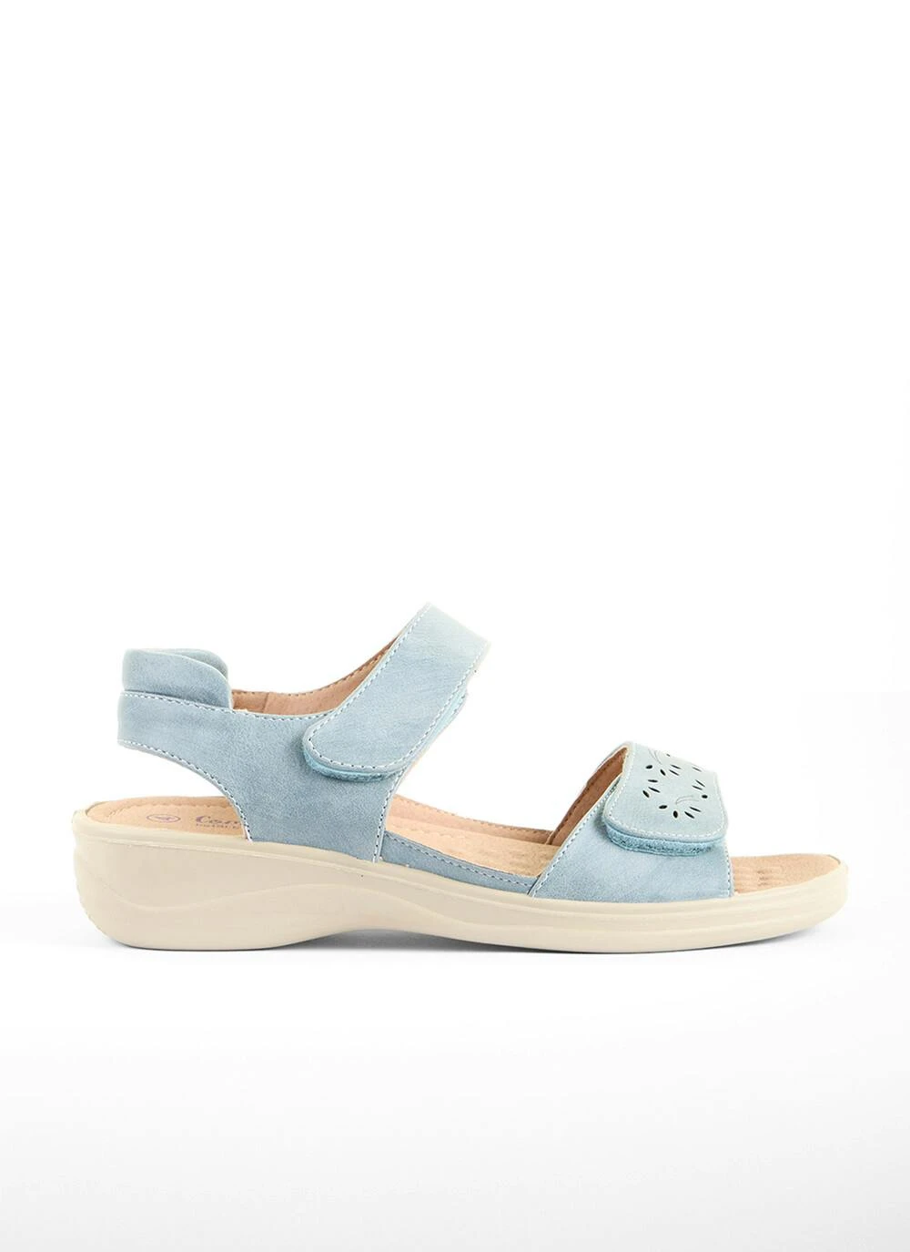 Sandal with a cushioned ankle strap and dual easy touch strap fastening. A lightweight low wedge outsole unit and cushioned insoles add all day comfort.