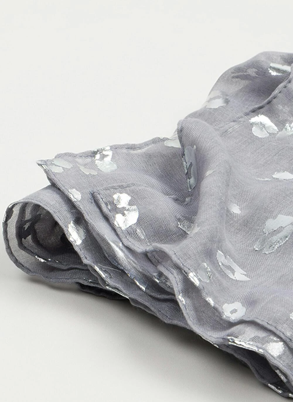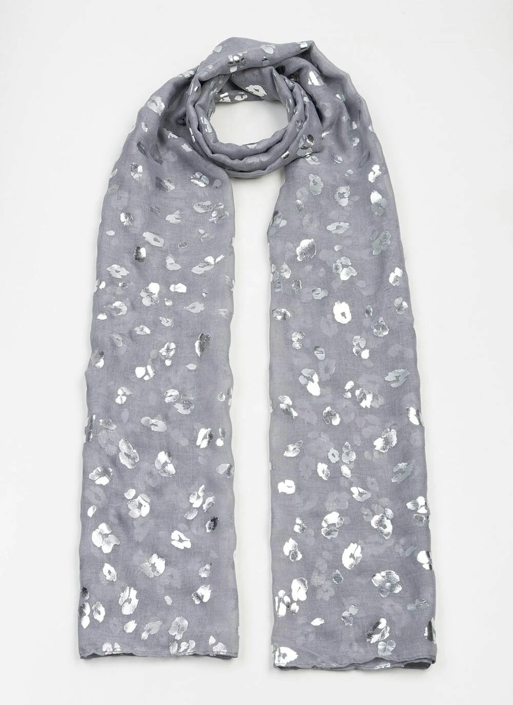 Accessorise your outfit in style with this lightweight scarf featuring a delicate shimmering foil print.
