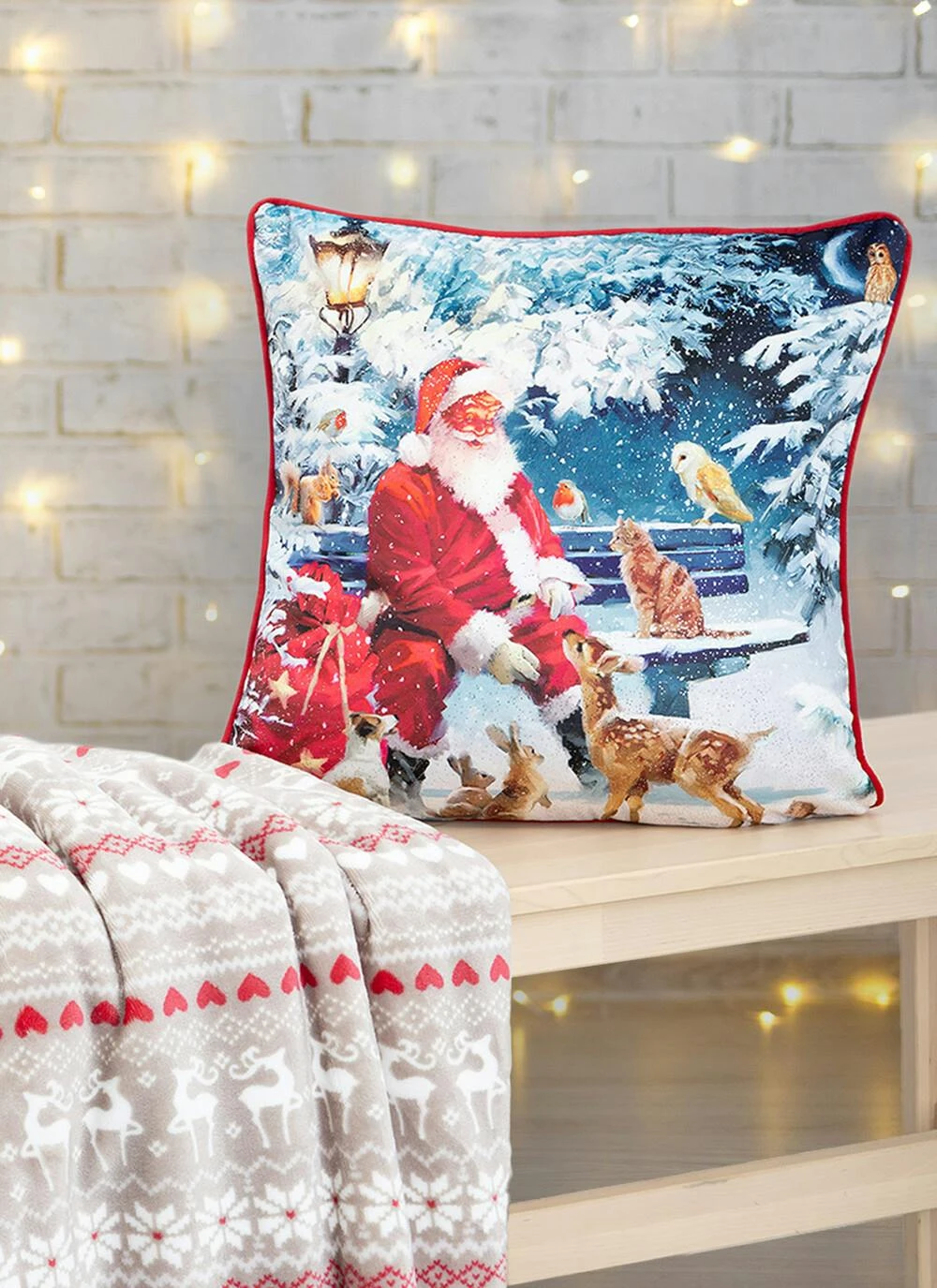 Add a touch of festive nostalgia with this Santa & Friends print cushion. Made from soft velvet with a seasonal plain red reverse and matching piping, the glitter finish adds that extra Christmas sparkle. The removeable cover is machine washable offering great practicality to this quirky piece.
