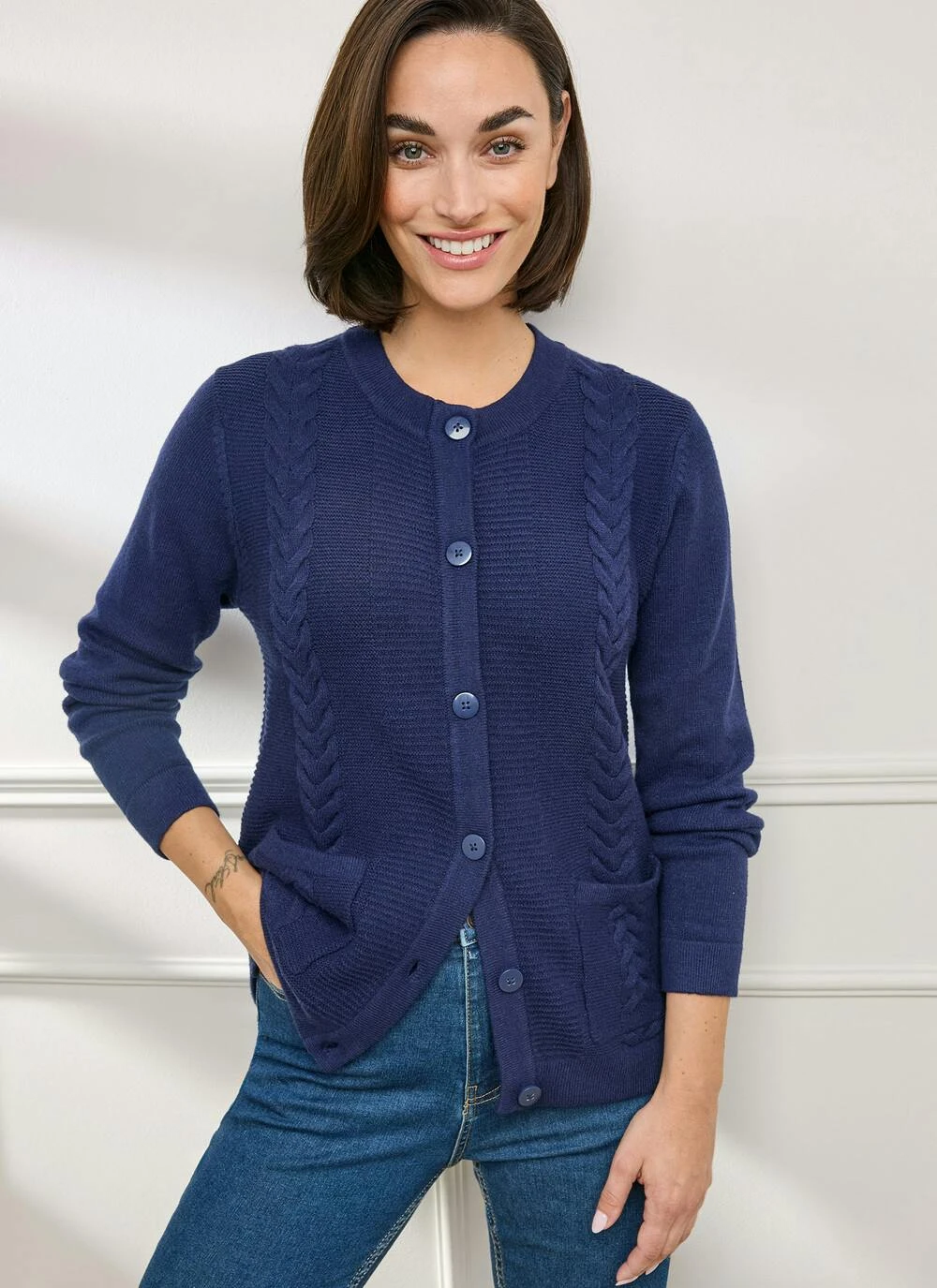 Button up round neck cardigan with long sleeves and two functioning front pockets, featuring feminine cable detailing. Team with Honor Millburn Collection trousers and skirts for a lovely fresh look for the new season.