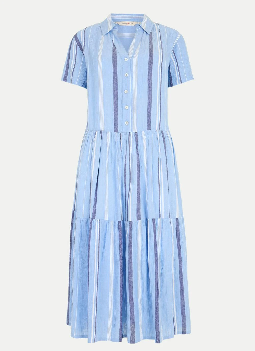 The Textured Stripe Shirt Dress in shades of blue offers a fresh, stylish look. Featuring a classic collar and short sleeves, this dress combines texture and subtle stripes for a modern twist. Its versatile design is perfect for everyday your summer wardrobe.