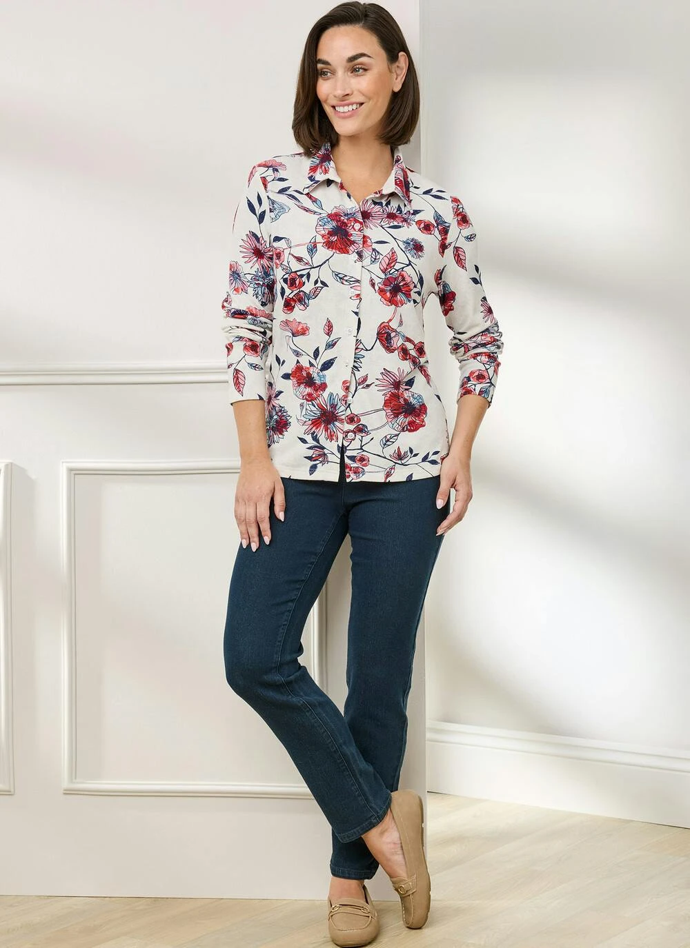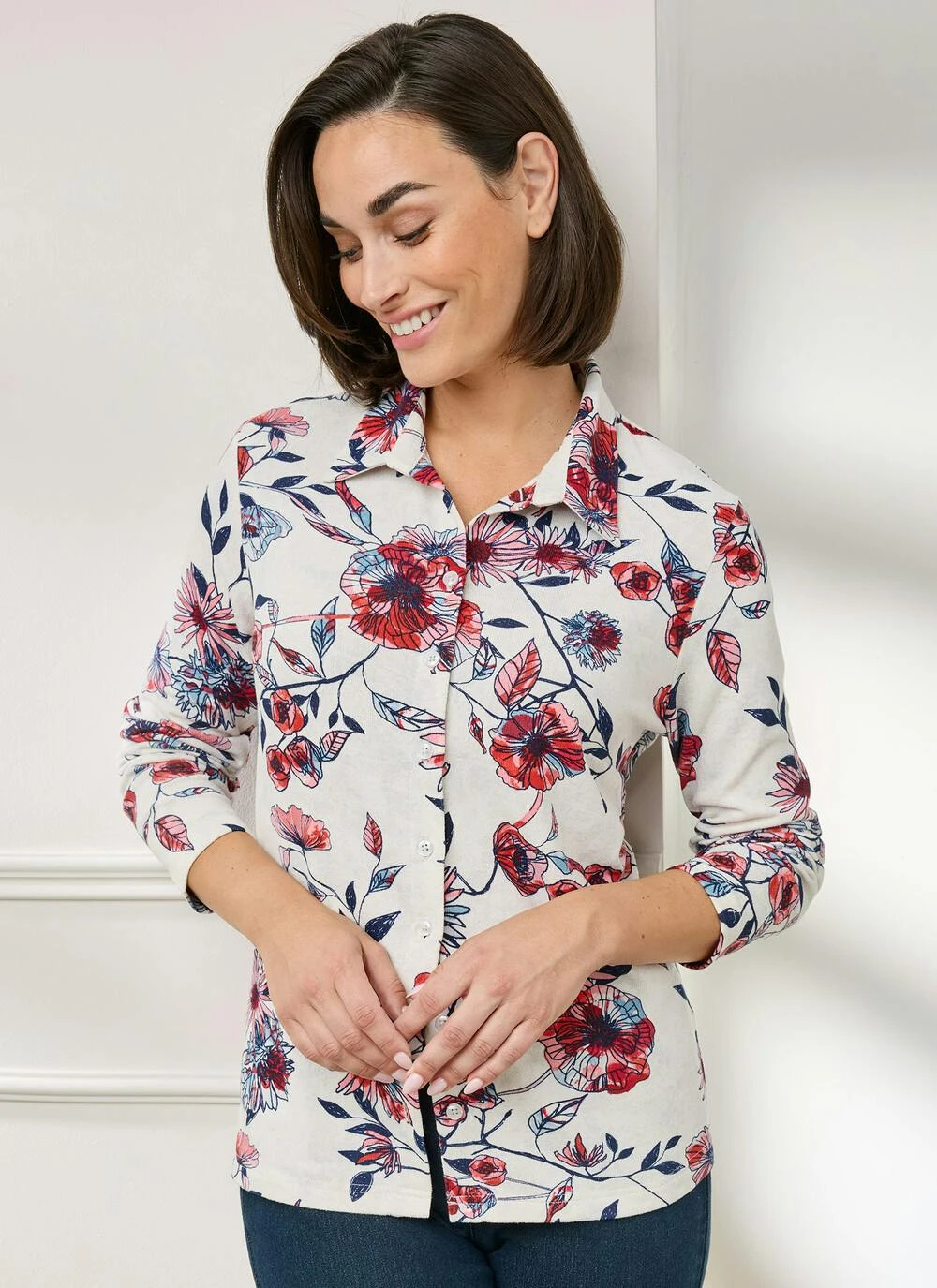 Blouse in an attractive and modern print, made from a warm touch, brushed jersey fabric. Featuring a collar, centre front buttons and long sleeves, this blouse has a comfortable and flattering fit. Team with Honor Millburn Collection trousers and skirts to refresh your seasonal wardrobe.
